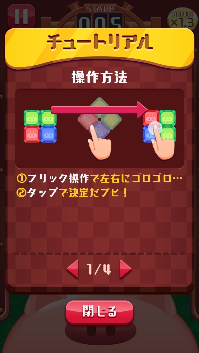 同じ色のブロックを4つそろえて、消して、お金を貯めましょう。