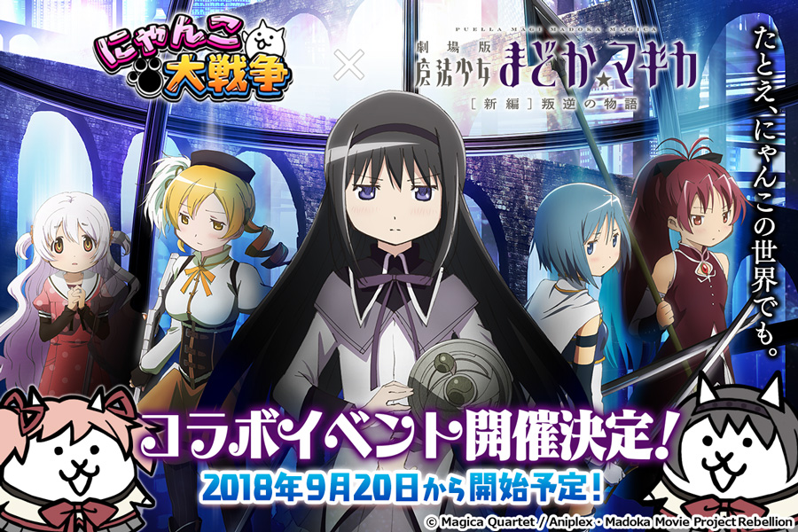 ポノス株式会社(京都府京都市)は、同社のスマートフォン向けゲームアプリ「にゃんこ大戦争」にて、「劇場版魔法少女まどか☆マギカ[新編]叛逆の物語」とのコラボレーションイベントを、2018年9月20日(木)より開始いたします。これを記念したSNSキャンペーンを本日より実施いたしますので、お知らせいたします。