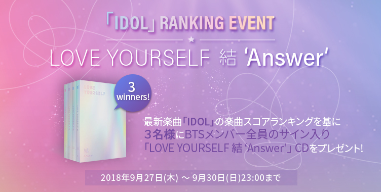 最新曲「IDOL」の楽曲スコアランキングに応じて合計3名様にBTSメンバー全員の「サイン入りCD」が当たるランキングイベントを開始しました。ランキング上位を目指して「IDOL」をプレイしてみよう!