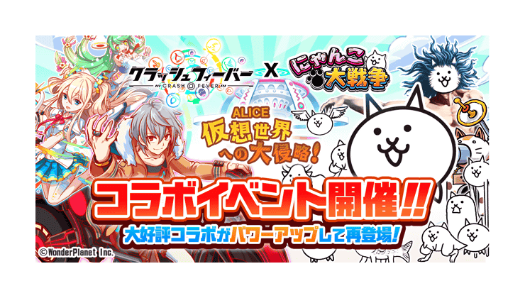 ポノス株式会社(京都府京都市)は、同社のスマートフォン向けゲームアプリ「にゃんこ大戦争」にて、ワンダープラネット株式会社(愛知県名古屋市)のスマートフォン向けゲームアプリ「クラッシュフィーバー」とのコラボレーションイベントを、2018年10月5日(金)より開始いたしましたので、これをお知らせいたします。