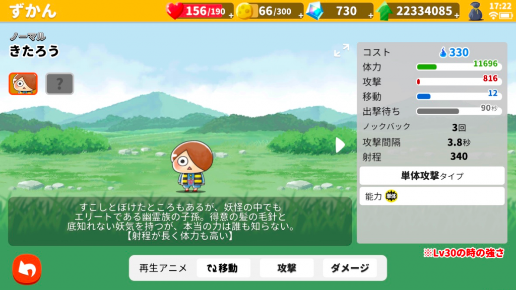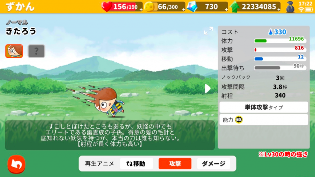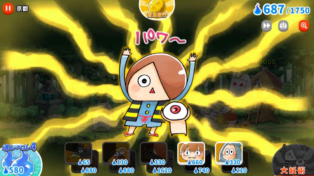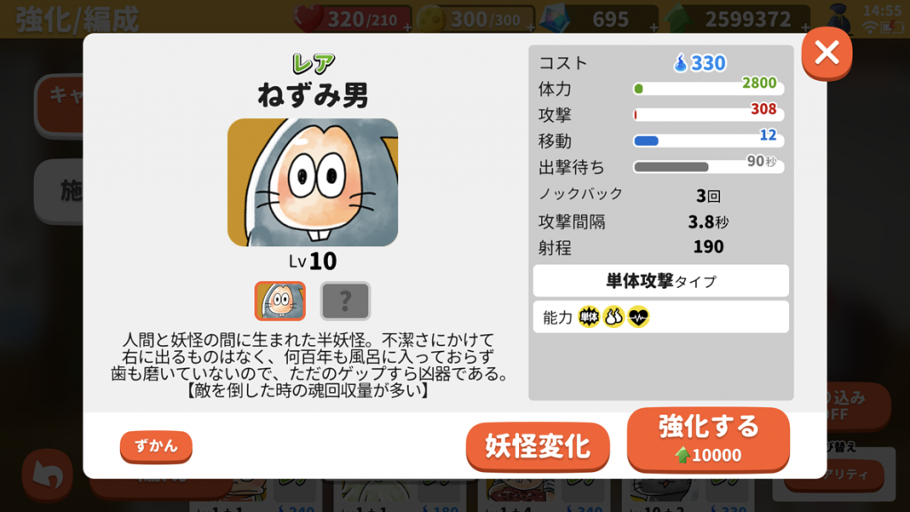 キャラクターは経験値を消費することで強化できます。妖怪変化(進化)は、経験値の他にキャラクター毎に進化条件が複数必要。キャラクターにより速度や能力が異なり、ステージに応じてキャラクターを使い分けることが勝利するためのポイントです。