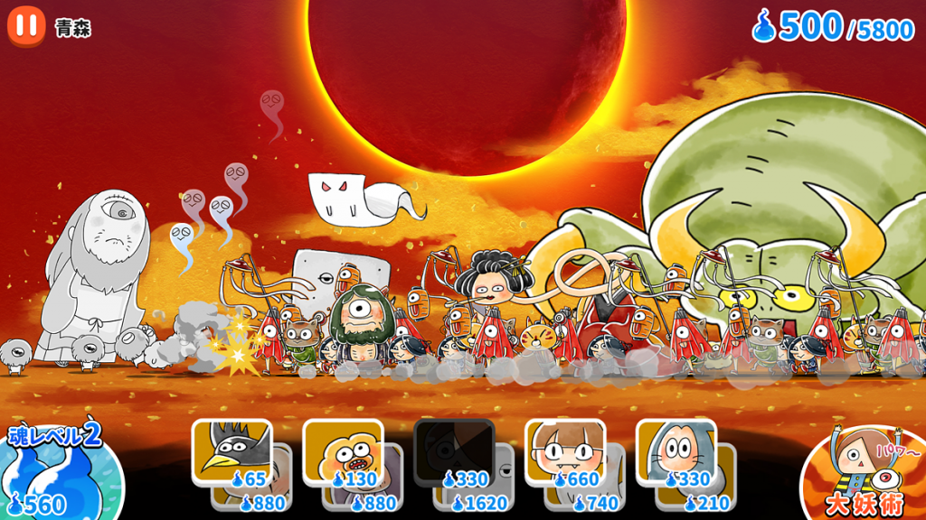 本作は、3,900万ダウンロードを達成した『にゃんこ大戦争』のタワーディフェンスバトルを基盤としました。戦闘中は、時間の経過で貯まる『魂』を使ってキャラクターを呼び出します。魂レベルを上げると魂の貯まる速度と最大値が上がります。また、敵全体に攻撃を与える『大妖術』も搭載。さらに、本作ならではの機能として「百鬼夜行モード」を実装しました。本機能を使用すると、溢れるほどの妖怪が出現して敵を押し返します!出せるタイミングが1回の戦闘で一回のみのため、どのタイミングで使うのかがポイントです。
