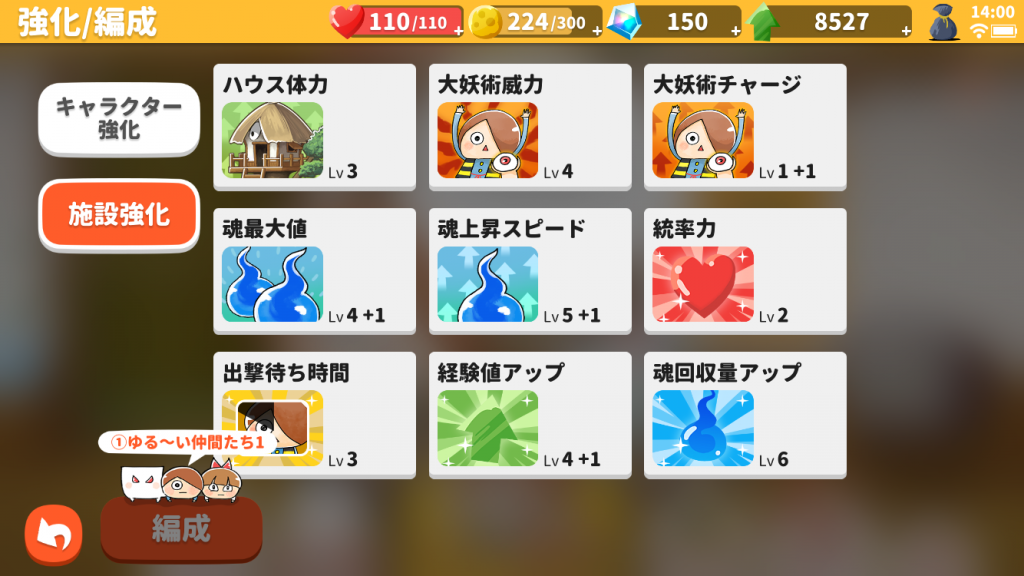 ▲キャラクター以外に施設を強化することで、ゲームをより有利に進められます。