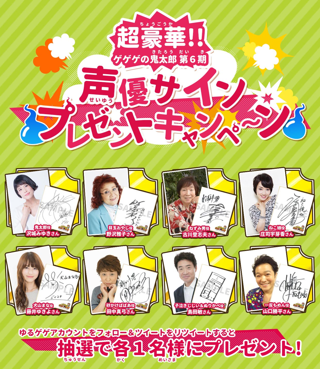 ゆるゲゲ公式Twitter(https://twitter.com/yurukitagame)をフォローし、対象のツイートをリツイートすると、鬼太郎役の沢城みゆきさん、目玉おやじ役の野沢雅子さんたち豪華声優陣のサイン入り色紙があたるキャンペーンを開催中です!