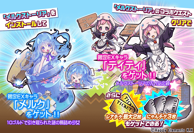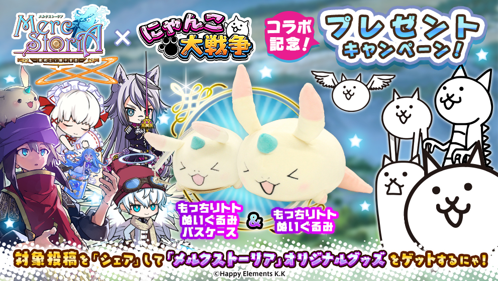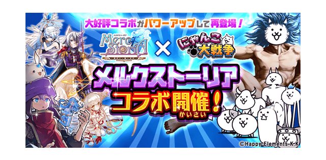 ポノス株式会社(京都府京都市)は、同社のスマートフォン向けゲームアプリ「にゃんこ大戦争」にて、Happy Elements株式会社(京都市下京区)のスマートフォン向けゲームアプリ「メルクストーリア」とのコラボレーションイベントを、2018年11月1日(木)より開始いたしましたので、これをお知らせいたします。