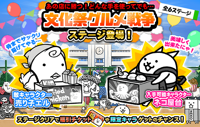 ステージをクリアすると、イベント期間中でしか手に入らないキャラクター「ネコ屋台」が極まれにゲットできるにゃ!