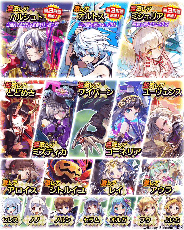 さらに、超激レアキャラ「ハルシュト」「ミシェリア」、激レアキャラ「オルトス」が新たに第3形態に進化可能に!