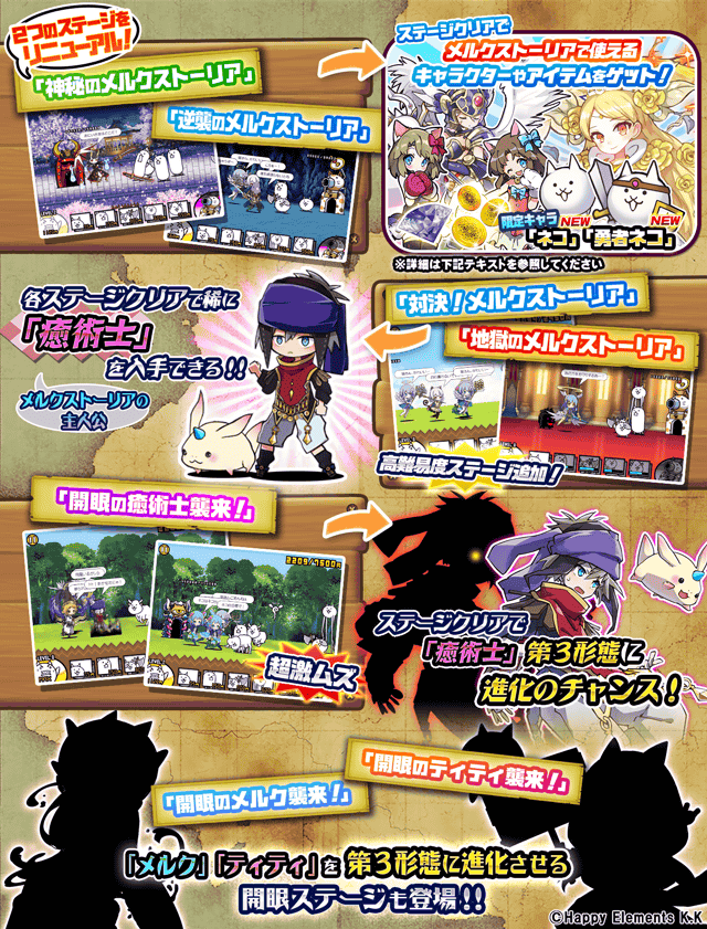 ステージクリアで、「癒術士」「メルク」「ティティ」をそれぞれ第3形態に進化させるチャンスにゃ!