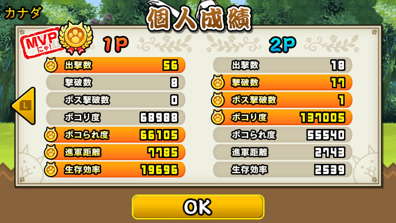 ふたりプレイではキャラ編成で5体を分けあって連携バトルができます。ふたりのチカラが必要な超にゃんこ砲も協力プレイならではの要素です。ふたりでステージクリアした後には、お互いの相性や、お互いの頑張り度を振り返る結果画面が表示されます。