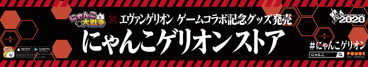 ポノス株式会社(本社:京都府京都市、代表取締役:辻子依旦、以下「ポノス」)は、同社のスマートフォン向けゲームアプリ『にゃんこ大戦争』におきまして、7月18日(木)より実施する『エヴァンゲリオン』とのコラボレーションイベント(URL:https://battlecats.club/special/2019_evangelion)に伴い、『エヴァンゲリオン』のキャラクターが『にゃんこ大戦争』とコラボしたグッズを7月17日(水)より順次、「EVANGELION STORE」など全国全7店舗で発売を開始いたします。また、コラボを記念し、期間限定の「にゃんこゲリオンストア」もオープンしますので、これをお知らせいたします。