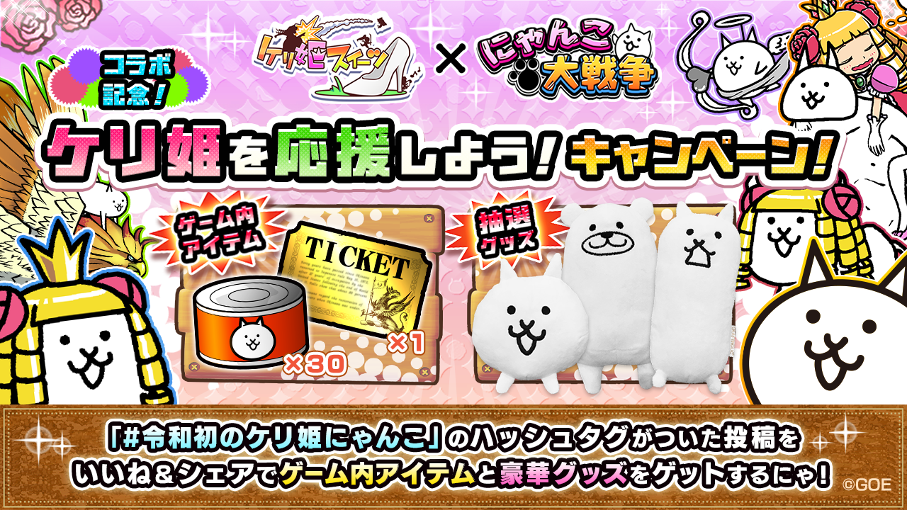 公式Twitterのアカウントをフォローして、ハッシュタグ「#令和初のケリ姫にゃんこ」を含む該当ツイートを「シェア」または「いいね」で、「にゃんこ大戦争」内で使用できるレアチケットや、抽選でリアルグッズをプレゼントいたします。 どしどしご参加ください!