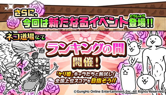 ネコ道場「ランキングの間」にてコラボ期間限定のランキングイベント「襲来!ケリ姫軍団」を開催いたします。「ケリ姫スイーツ」のキャラクターが多数登場する腕試しイベントとなっております。