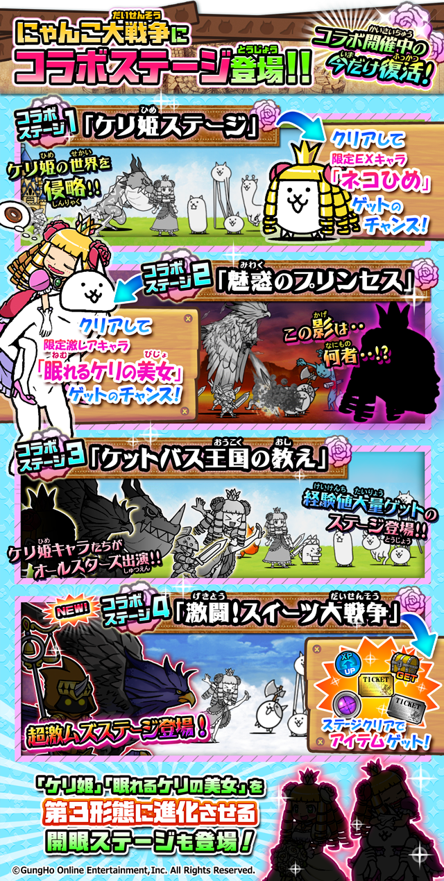 ポノス株式会社(本社:京都府京都市、代表取締役:辻子依旦、以下「ポノス」)は同社のスマートフォン向けゲームアプリ「にゃんこ大戦争」において、ガンホー・オンライン・エンターテイメント株式会社(東京都千代田区)が提供するスマートフォン向けゲームアプリ「ケリ姫スイーツ」とのコラボイベントを2019年7月1日(月)11:00より開始いたしましたので、これをお知らせいたします。