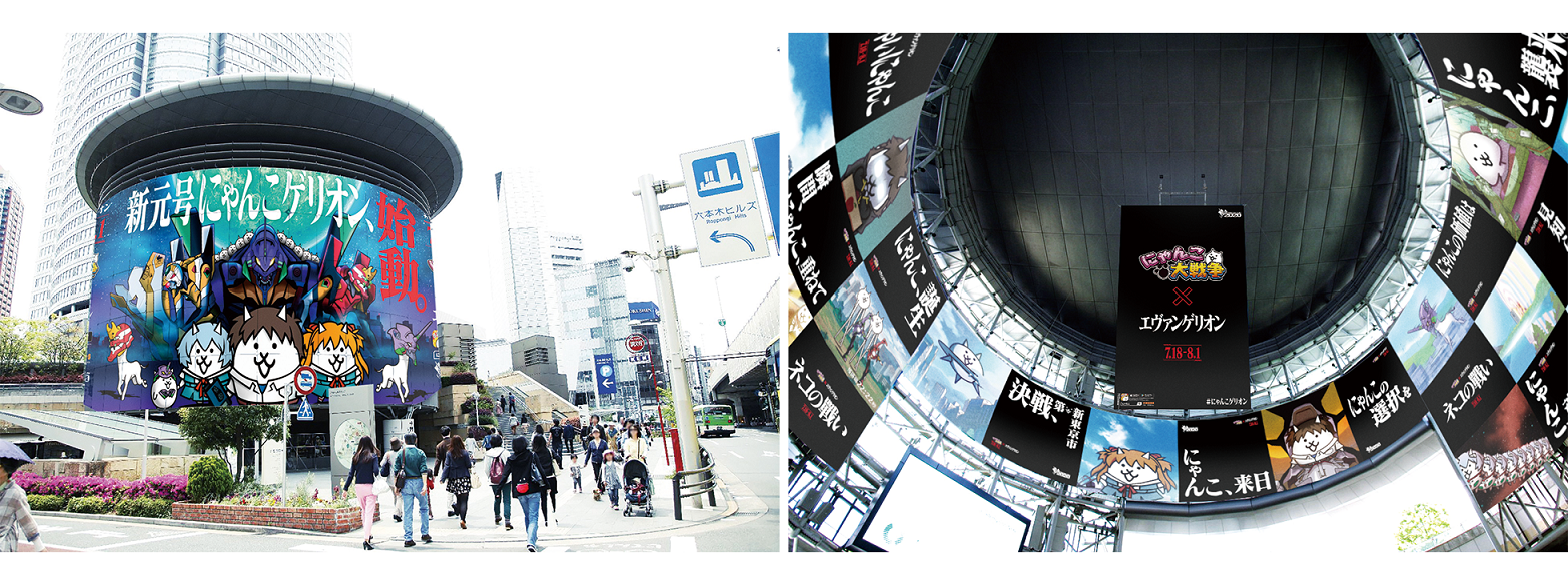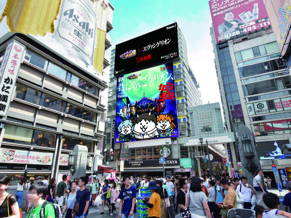 公開したキービジュアルと屋外広告は『にゃんこ大戦争』と『エヴァンゲリオン』の世界観を融合させ、コラボの面白さを強調したデザインになりました。屋外広告は、7月15日(月)の大阪・道頓堀のツタヤエビスバシヒットビジョン掲出を皮切りに、18日(木)に東京・六本木ヒルズ メトロハットなど全国で順次掲出します。