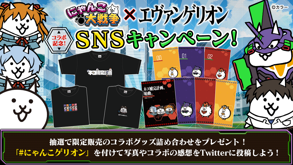 公式Twitterのアカウントをフォローして、ハッシュタグ「#にゃんこゲリオン」を付けて、Twitterに投稿すると、限定販売のコラボグッズ詰め合わせを抽選でプレゼントします。どしどしご応募ください!