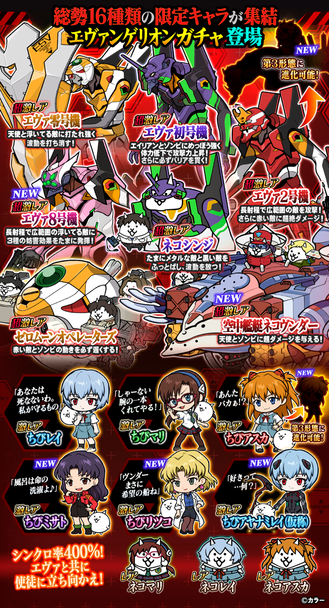 前回のコラボで登場したキャラクターはもちろん、限定キャラクター「エヴァ8号機」「空中艦艇ネコヴンダー」「ちびミサト」「ちびリツコ」「ちびアヤナミレイ(仮称)」が新たに参戦します。