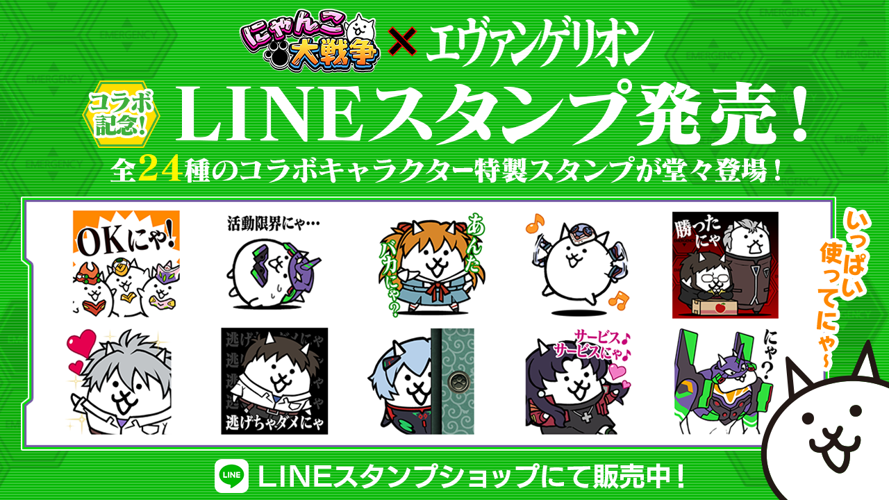 コラボを記念して、『にゃんこ大戦争』×『エヴァンゲリオン』のコラボLINEスタンプを発売します。全24種類で、様々なシーンで使用できるコラボスタンプになっております。