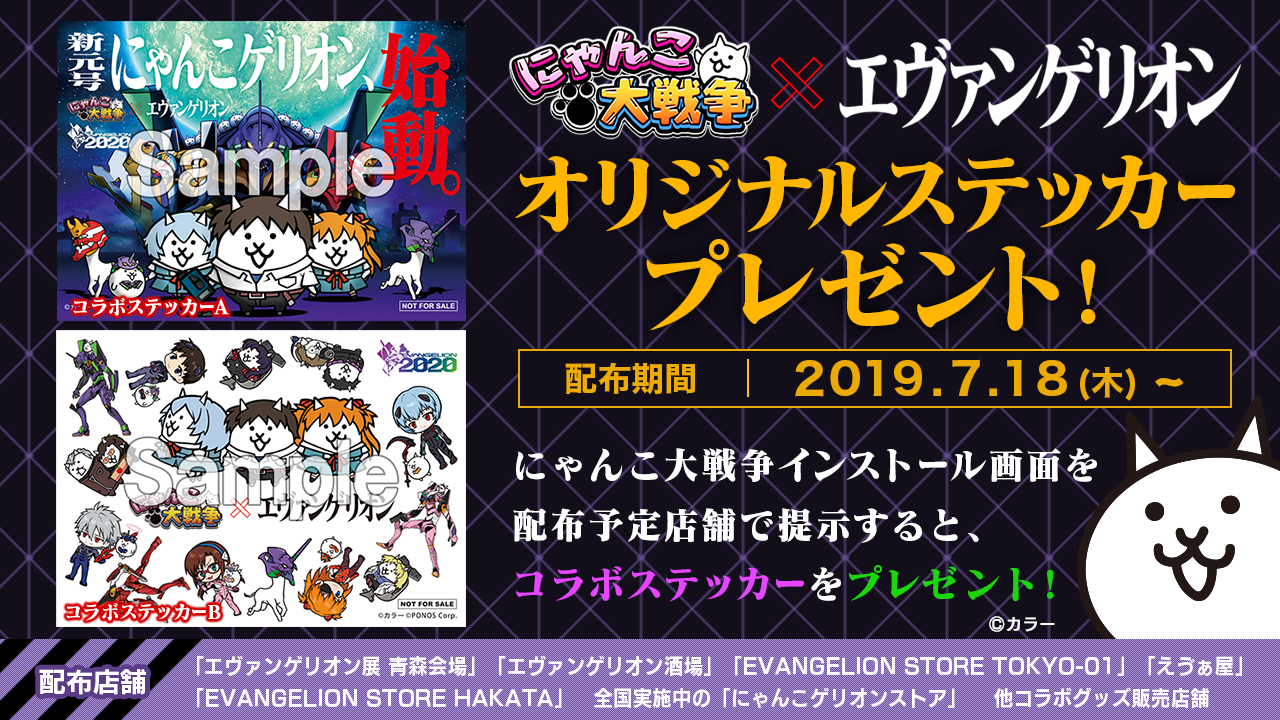 7月18日(木)より、『にゃんこ大戦争×エヴァンゲリオンコラボ』を記念して、全国各地でオリジナルステッカーを配布中です。