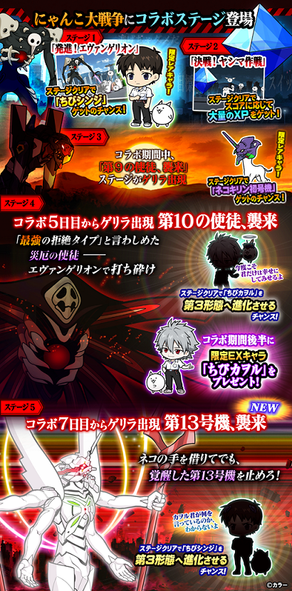前回のコラボで登場したステージも復刻し、さらに今回のコラボ期間後半からは、新たなるコラボ限定ステージ「第13号機、襲来」が登場します。『にゃんこ大戦争』で再現される『エヴァンゲリオン』の世界をぜひお楽しみください。