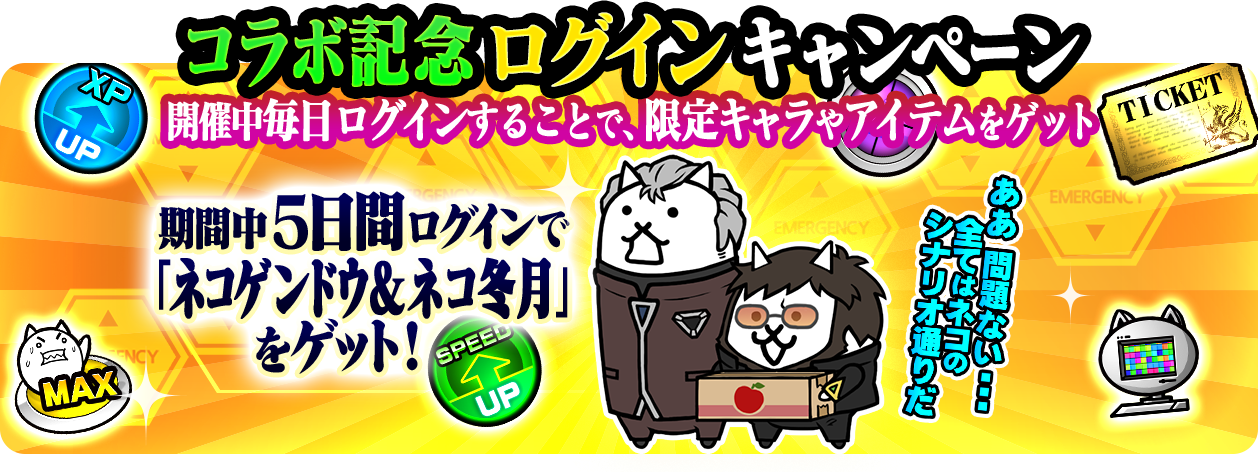 期間中5日間ログインすると、コラボ限定EXキャラクター「ネコゲンドウ&ネコ冬月」を入手できます。