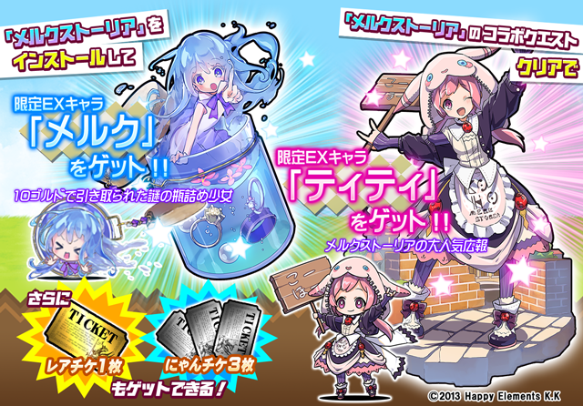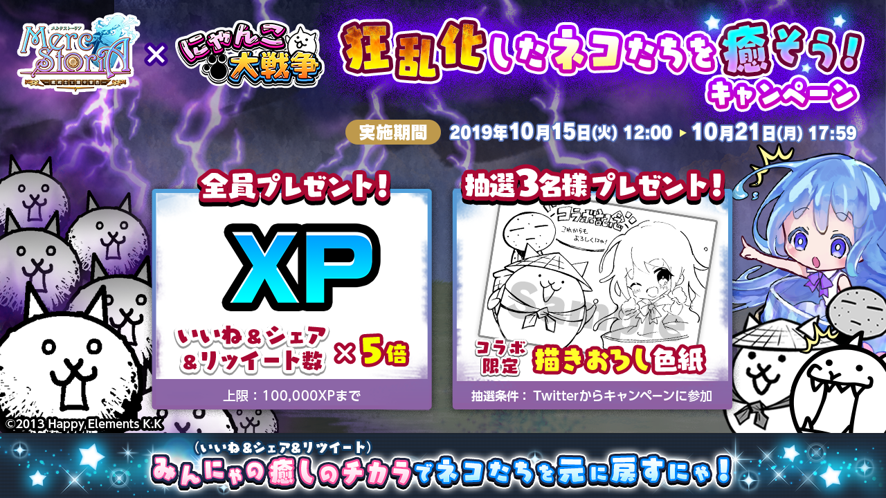 ポノス株式会社(本社:京都府京都市、代表取締役:辻子依旦、以下「ポノス」)は同社のスマートフォン向けゲームアプリ「にゃんこ大戦争」において、Happy Elements株式会社(京都市下京区)のスマートフォン向けゲームアプリ「メルクストーリア」とのコラボレーションイベントを2019年10月16日(水)11:00より開始いたしましたので、これをお知らせいたします。