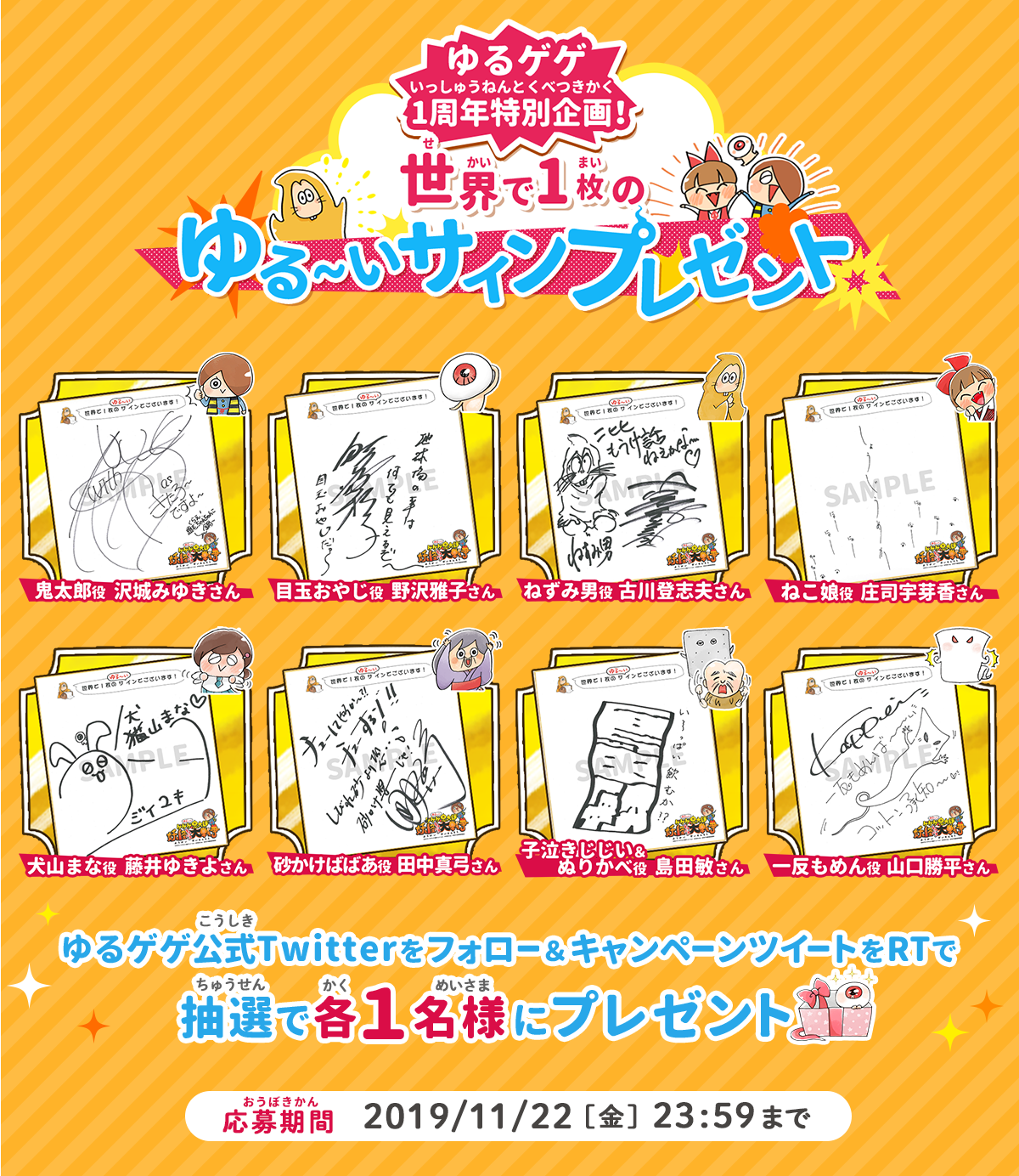 ゆるゲ大戦争製作委員会(配信・企画:東映アニメーション株式会社、企画・開発・運営:ポノス株式会社、企画協力・運営協力:株式会社ディー・エヌ・エー)は、人気アニメ『ゲゲゲの鬼太郎』を題材としたスマートフォン向けゲーム『ゆる~いゲゲゲの鬼太郎 妖怪ドタバタ大戦争』(略称:ゆるゲゲ)におきまして、アニメ「ゲゲゲの鬼太郎」出演声優陣の“ゆる~い”サインが当たるキャンペーンの開催、超激レア初の第2妖怪変化や「+(プラス)値」による能力解放など新たな育成要素の追加をお知らせいたします。