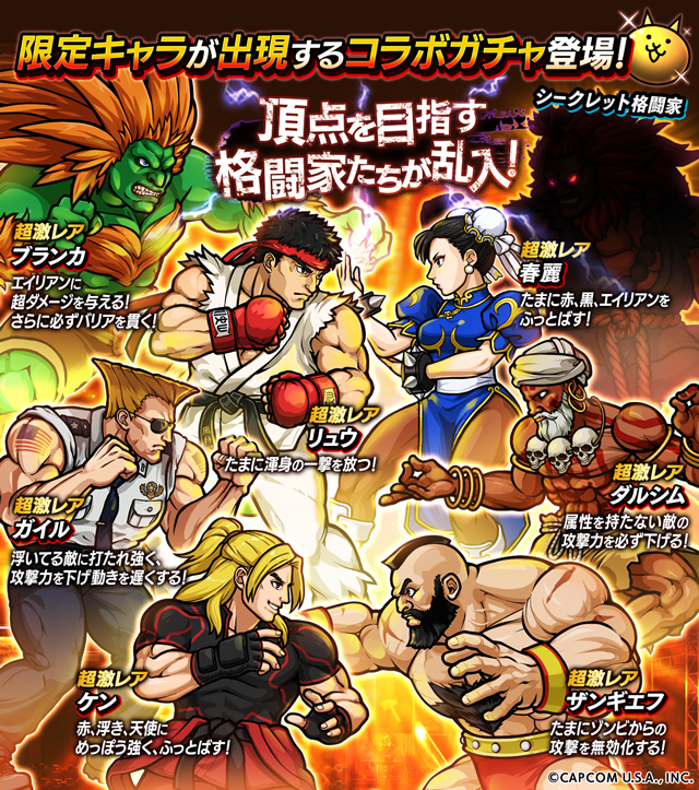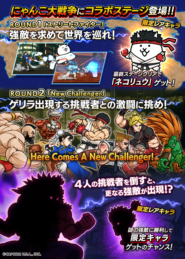 ポノス株式会社(本社:京都府京都市、代表取締役:辻子依旦、以下「ポノス」)は同社のスマートフォン向けゲームアプリ『にゃんこ大戦争』において、株式会社カプコン(大阪市中央区)のPlayStation®4 / PC向け対戦格闘ゲーム『ストリートファイターV アーケードエディション』とのコラボレーションイベントを2019年11月1日(金)11:00より開始いたしましたので、これをお知らせいたします。