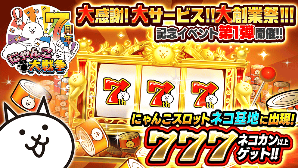 期間中、ネコカン777個以上が必ず当たる「にゃんこスロット」が登場します。
