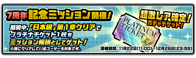 期間中に「日本編」第1章をクリアすることでプラチナチケットを1枚ゲットできる7周年記念ミッションが登場いたします。既にクリアしているユーザーの方もゲットできますので、ぜひチェックしてください。