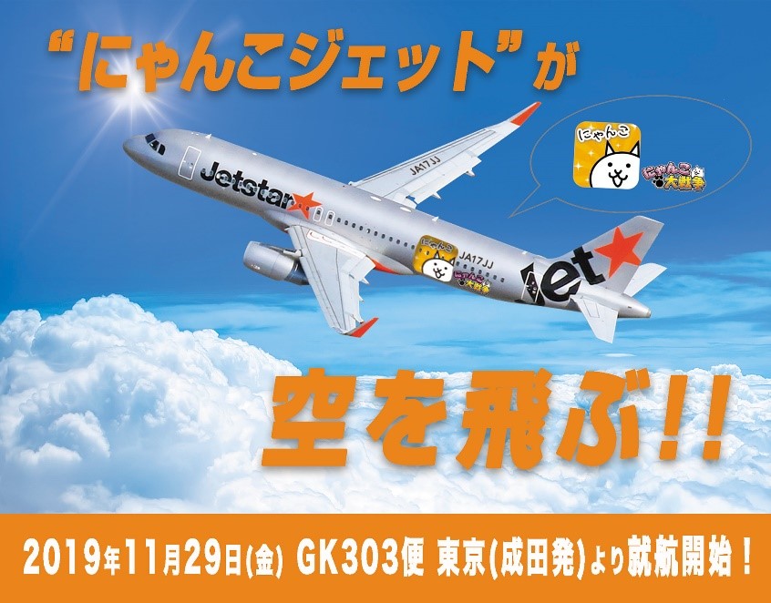 11月29日(金)より、『にゃんこ大戦争』ラッピング飛行機「にゃんこジェット」が日本中の空を飛びます。また、12月~1月の2か月間ジェットスターの機内誌に『にゃんこ大戦争』の特集ページが掲載されます。