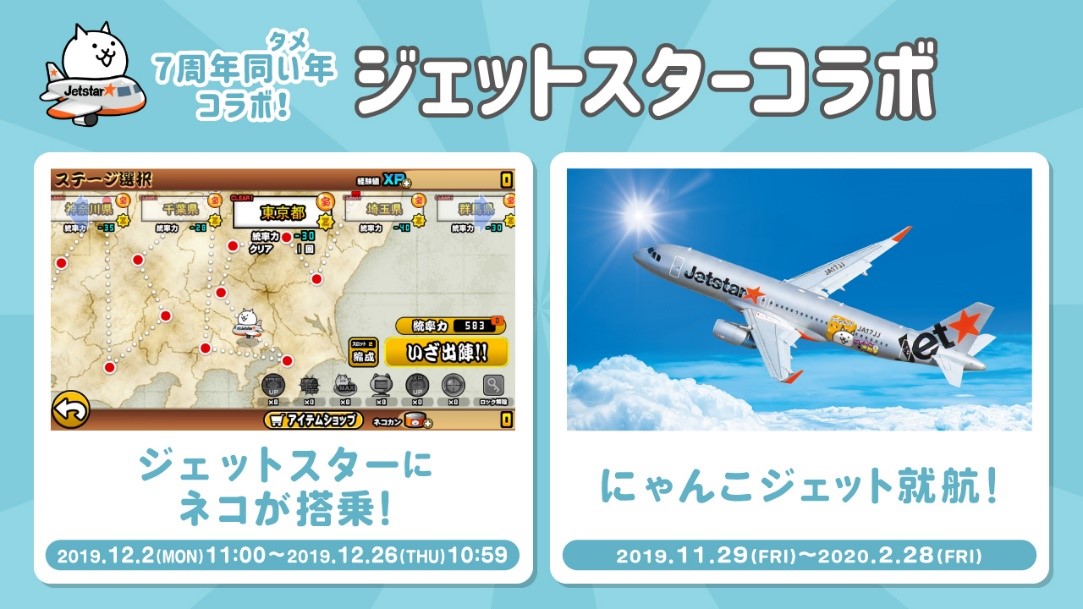 ポノス株式会社(本社:京都府京都市、代表取締役:辻子依旦、以下「ポノス」)が提供するスマートフォン向けゲームアプリ『にゃんこ大戦争』は、「東京スカイツリー」「ジェットスター」とのコラボ開催を発表いたします。2019年、『にゃんこ大戦争』と同様に7周年を迎えた「東京スカイツリー」「ジェットスター」と、それぞれ夢のコラボが実現しました。ゲーム内でのコラボレーションやリアルイベント、大サービスなプレゼント企画等を準備していますので、「7周年同い年(タメ)コラボ」をぜひお楽しみください。