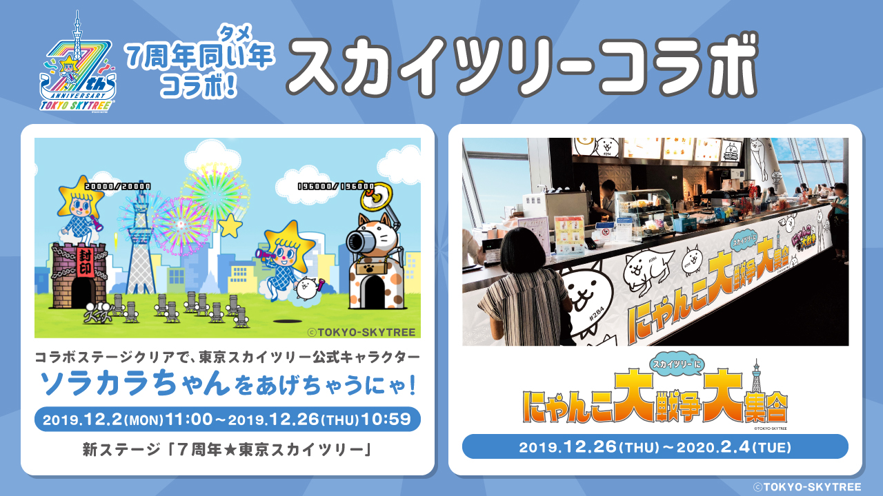 今年で7周年を迎える「東京スカイツリー」とのコラボイベント「にゃんこ大戦争 スカイツリー®︎に大集合」を2019年12月26日(木)より開催します。