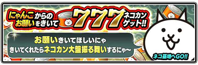 またまた大盤振る舞い!期間中ネコ基地画面に行くと、にゃんこがとあるお願いをしてくることがあります。「にゃんこからのお願い」を聞いてあげると、なんとネコカン777個をゲットできる大チャンス!いったいが起こるのかは、実際にログインして確かめてみてください。