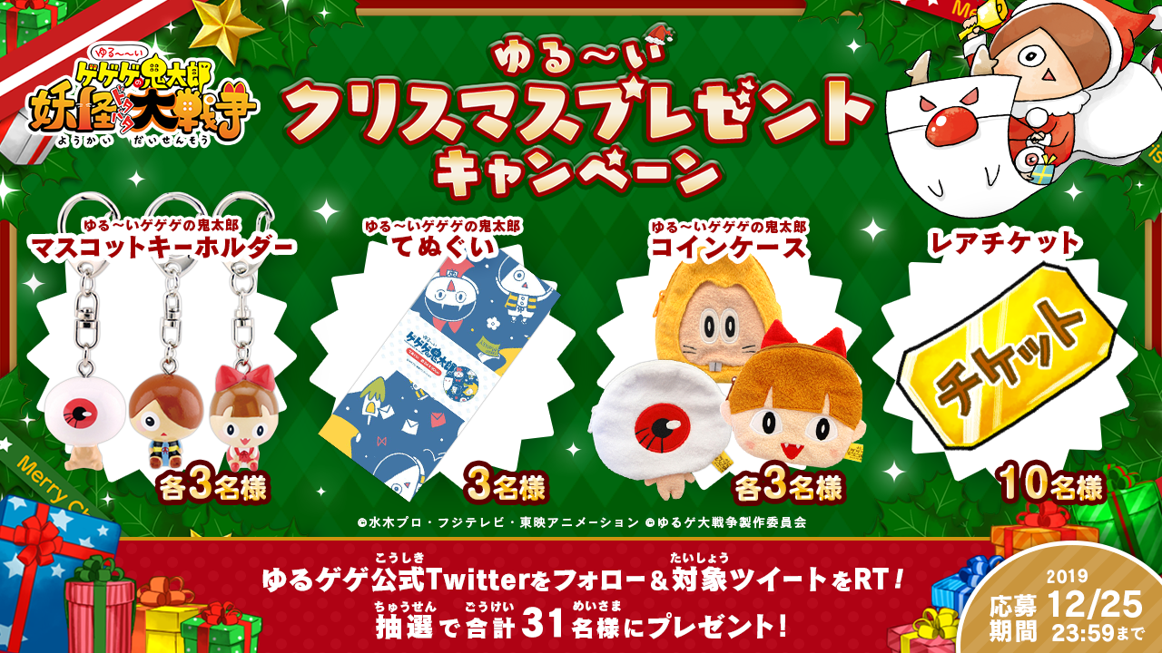ゆるゲ大戦争製作委員会(配信・企画:東映アニメーション株式会社、企画・開発・運営:ポノス株式会社、企画協力・運営協力:株式会社ディー・エヌ・エー)は、人気アニメ『ゲゲゲの鬼太郎』を題材としたスマートフォン向けゲーム『ゆる~いゲゲゲの鬼太郎 妖怪ドタバタ大戦争』(略称:ゆるゲゲ)におきまして、2019年12月13日(金)より、限定超激レアが10回ガチャで必ず手に入る「クリスマスガチャ」およびプレゼントが当たるSNSキャンペーン(https://yurukita-game.com/event/2019_christmas/index.html)を開催したことをお知らせいたします。
