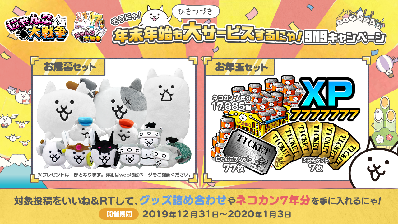 『にゃんこ大戦争』公式Twitterではネコカン7年分(17,885個)や、新発売のグッズセットが当たるキャンペーンを2019年12月31日(火)12:00より開催いたしております。『にゃんこ大戦争』7周年の大サービスは年末年始も続きます。公式Twitterで抽選にチャレンジしましょう!