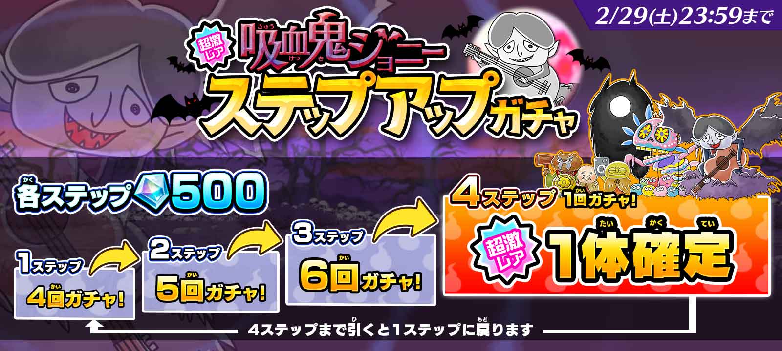 今回新登場の超激レア「吸血鬼ジョニー」は「ステップアップガチャ」、「吸血鬼ジョニーガチャ」の開催終了後、一定期間登場しないキャラクターとなりますのでぜひチェックしましょう!
