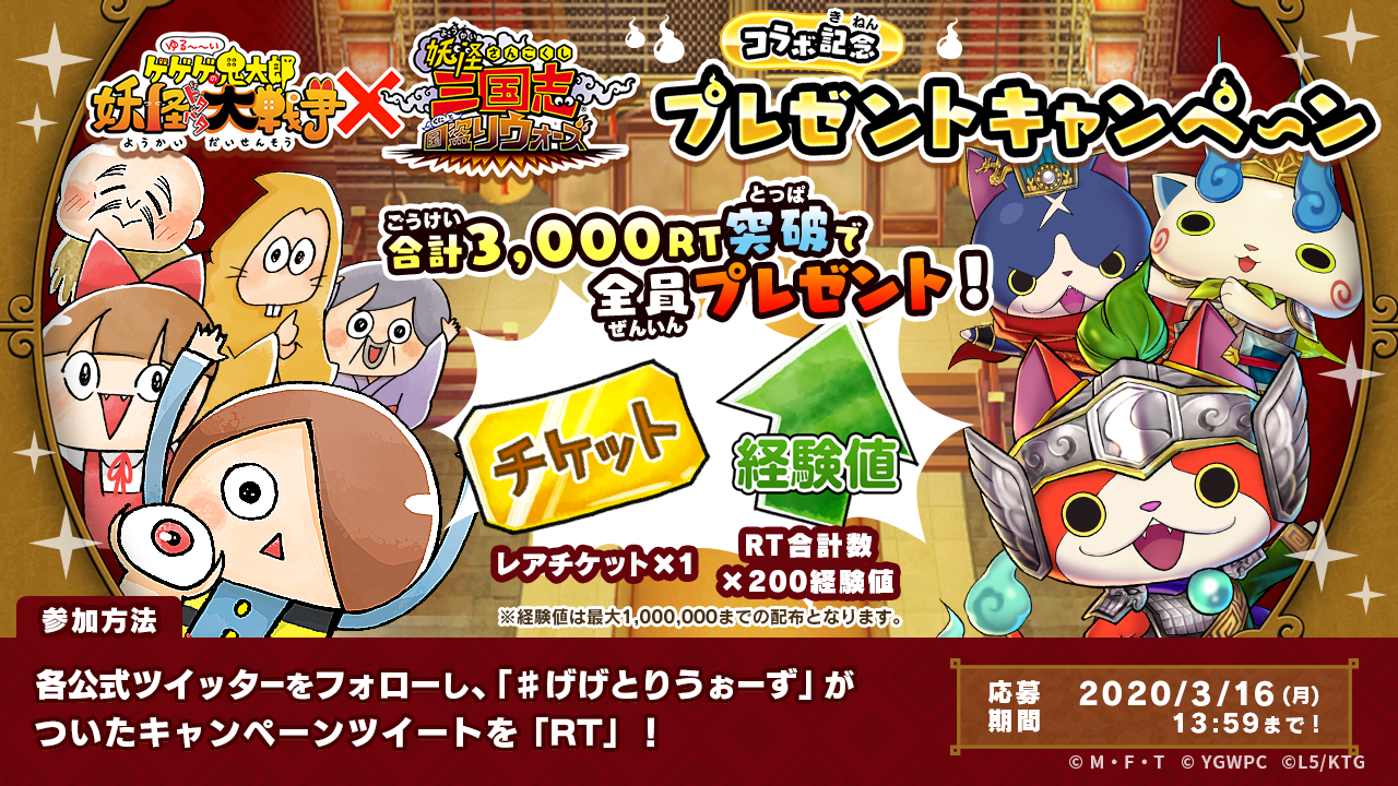 ゆるゲ大戦争製作委員会(配信・企画:東映アニメーション株式会社、企画・開発・運営:ポノス株式会社、企画協力・運営協力:株式会社ディー・エヌ・エー)は、人気アニメ『ゲゲゲの鬼太郎』を題材としたスマートフォン向けゲーム『ゆる~いゲゲゲの鬼太郎 妖怪ドタバタ大戦争』(略称:ゆるゲゲ)におきまして、株式会社レベルファイブが制作・配信、株式会社コーエーテクモゲームスが開発・運営する国盗り戦略RPG『妖怪三国志 国盗りウォーズ』とのコラボイベントを、本日3月2日(月)より開始しましたことをお知らせいたします。