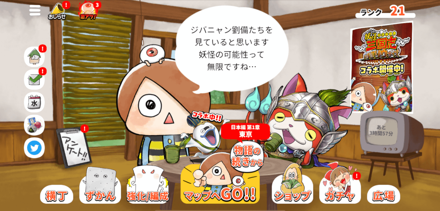 コラボイベント開催期間中、「きたろうのへや」が「ジバニャン劉備」、「ウィスパー孔明」が登場する特別仕様に!