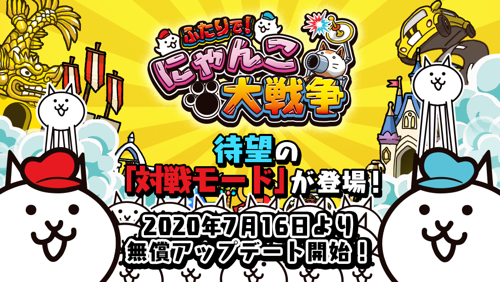 ポノス株式会社(本社:京都府京都市、代表取締役:辻子依旦、以下「ポノス」)が提供するスマートフォン向けゲームアプリ「にゃんこ大戦争」のNintendo Switch™版『ふたりで!にゃんこ大戦争』は、2020年7月16日(木)から、新たなコンテンツとなる「対戦モード」のアップデートを提供いたします。