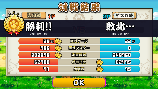 「対戦モード」の勝利条件は、先に相手の戦力ゲージをゼロにした方が勝利となりますが、時間切れになった場合、独自の指標で判定勝負になります。