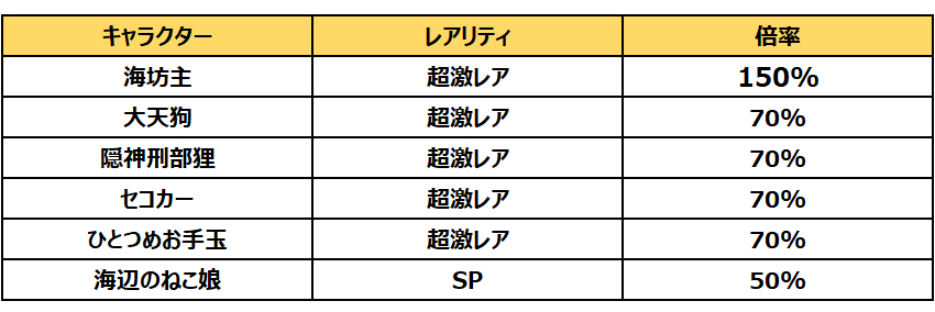 新超激レア「海坊主」の出現確率アップに加えて初回10回ガチャは超激レア確定のため、新キャラクターがより手に入りやすい内容になっています。