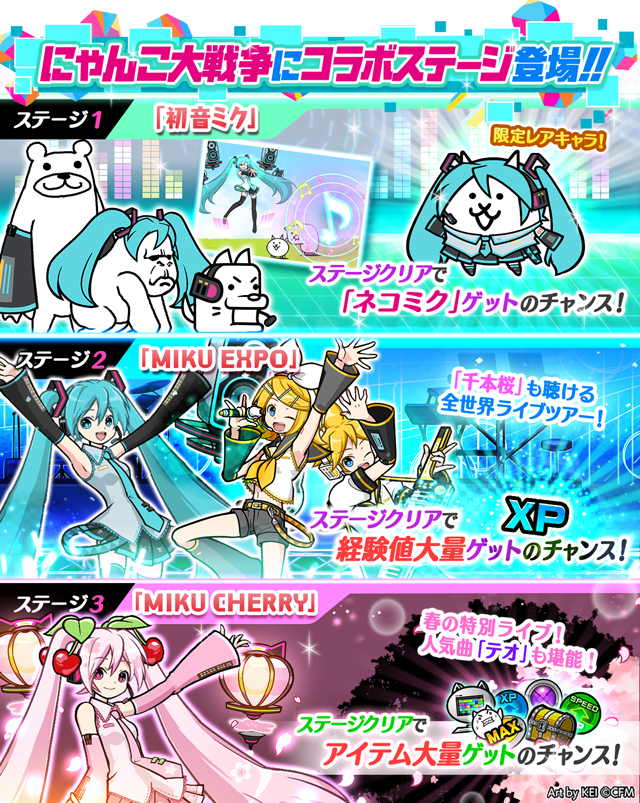 コラボステージ「初音ミク」ではわんこ軍団がミク化したコラボ限定キャラクターが多数登場!ステージクリアで限定レアキャラクター「ネコミク」がゲットできます。