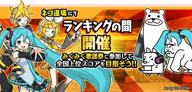ネコ道場「ランキングの間」にてコラボ期間限定のランキングイベント「みくみく歌謡祭」を開催いたします。「初音ミク」のキャラクターが多数登場する腕試しイベントとなっております。