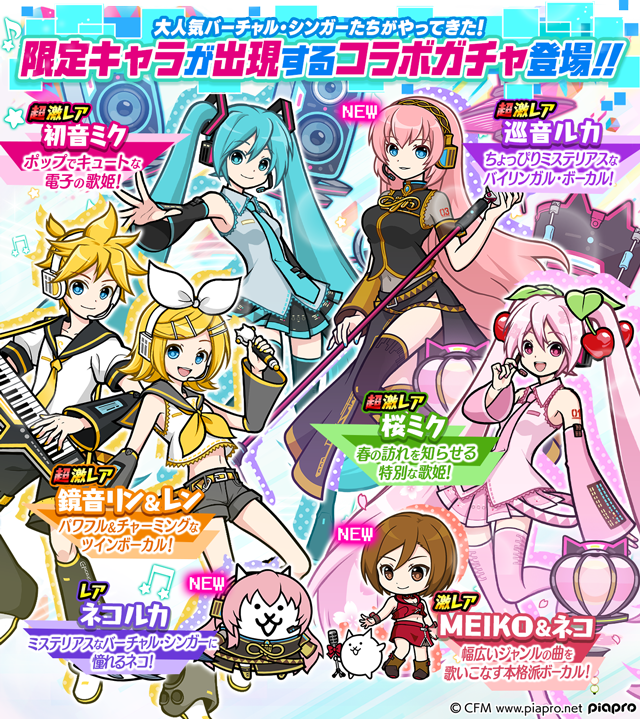 ポノス株式会社(本社:京都府京都市、代表取締役:辻子依旦、以下「ポノス」)は同社のスマートフォン向けゲームアプリ「にゃんこ大戦争」において、クリプトン・フューチャー・メディア株式会社(札幌市中央区)の人気キャラクター「初音ミク」および同シリーズの人気バーチャル・シンガーとのコラボレーションイベントを2020年8月7日(金)11:00より開始いたしましたので、これをお知らせいたします。