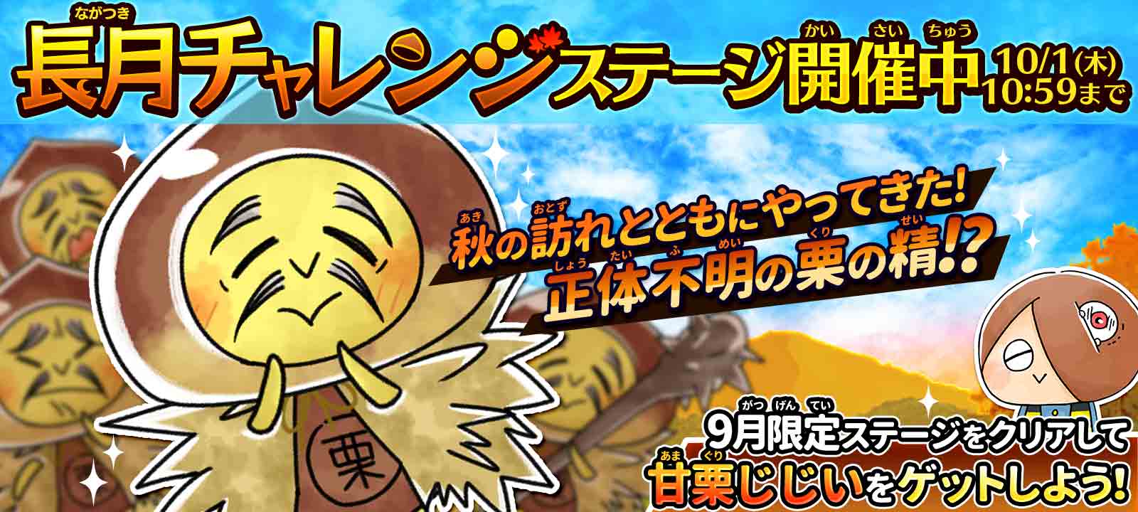 クリア時に一定の確率でSPキャラクター「甘栗じじい」が手に入る、9月限定ステージを開催いたします!
