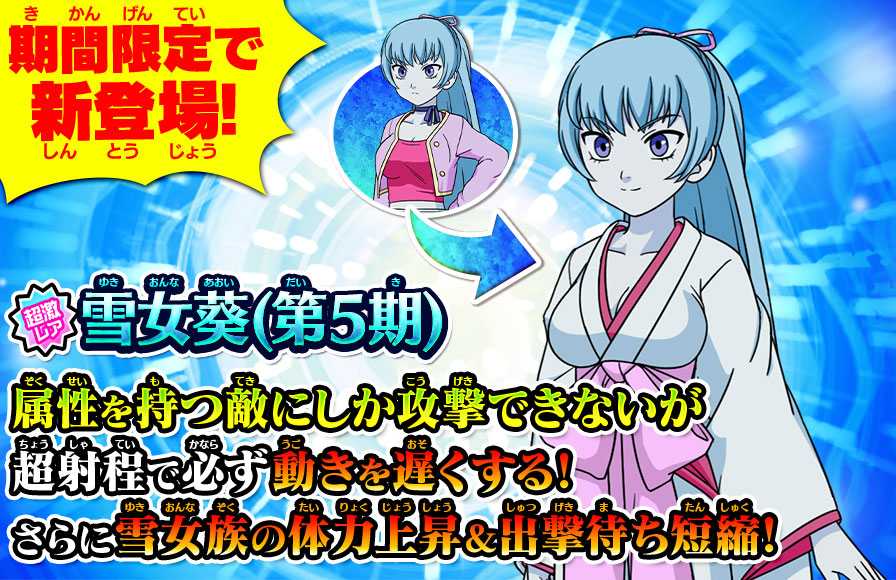 初開催となる今回は、アニメ「ゲゲゲの鬼太郎」(第5期)より「雪女葵」が限定超激レアになって登場!さらに今だけの出現確率アップを開催いたします。