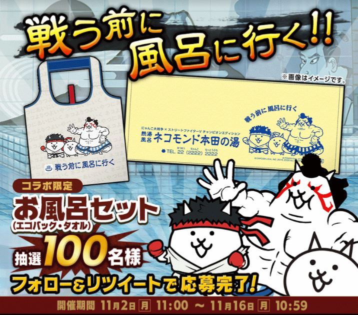 フォロー&RTしてくれた人の中から抽選で100名様に、ここでしか手に入らないコラボ限定デザインのお風呂セット(エコバッグ・タオル)が当たるチャンス!