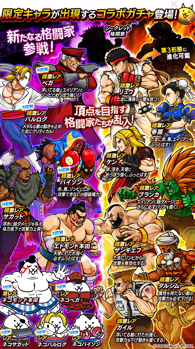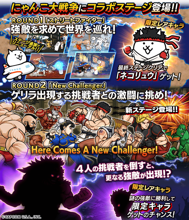 ポノス株式会社(本社:京都府京都市、代表取締役:辻子依旦、以下「ポノス」)は同社のスマートフォン向けゲームアプリ「にゃんこ大戦争」において、株式会社カプコン(大阪市中央区)のPlayStation®4 / PC向け対戦格闘ゲーム「ストリートファイターV チャンピオンエディション」とのコラボレーションイベントを2020年11月2日(月)11:00より開始いたしましたので、これをお知らせいたします。