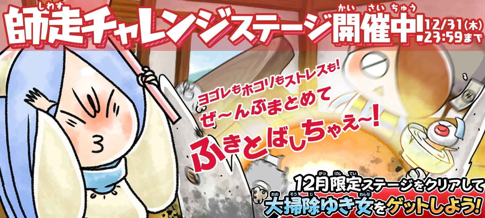 クリア時に一定の確率でSPキャラクター「大掃除ゆき女」が手に入る、12月限定ステージを開催いたします。