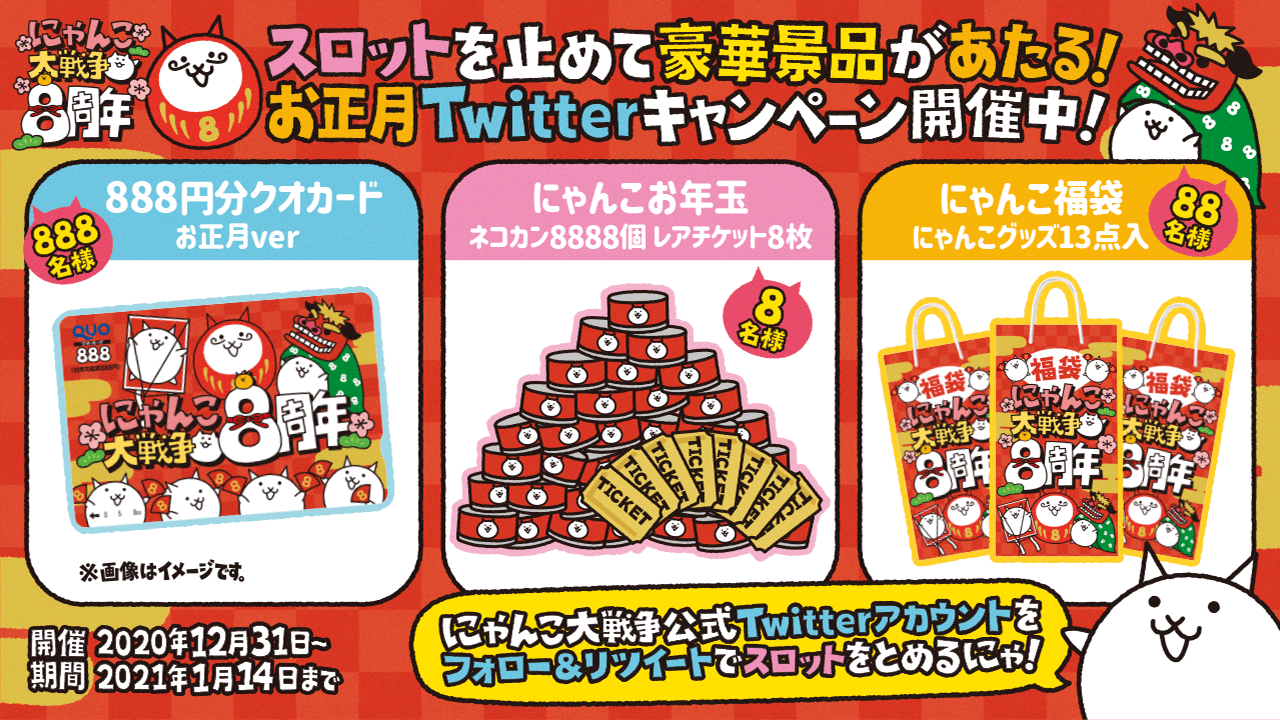 第3弾は「8」周年と「お正月」にちなみ、ネコカン8888個&レアチケット8枚の「にゃんこお年玉」を8名、にゃんこグッズ全13点が入った「にゃんこ福袋」を88名、888円分クオカードお正月verを888名にプレゼント。2021年も大盤振る舞いでスタートする、豪華なキャンペーンとなっております。